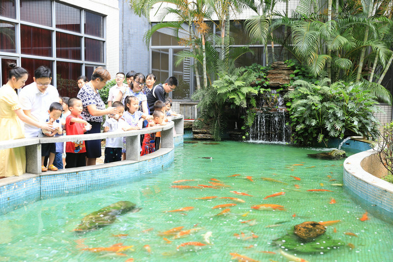 黃的、白的、黑的魚兒在水里游來游去,時不時悄悄冒出水面吐一個夢幻般的空氣泡..在參觀公司時,小朋友們來到了魚池邊,看到魚兒可興奮極了,并在爸爸媽媽的指導下給魚兒投食。